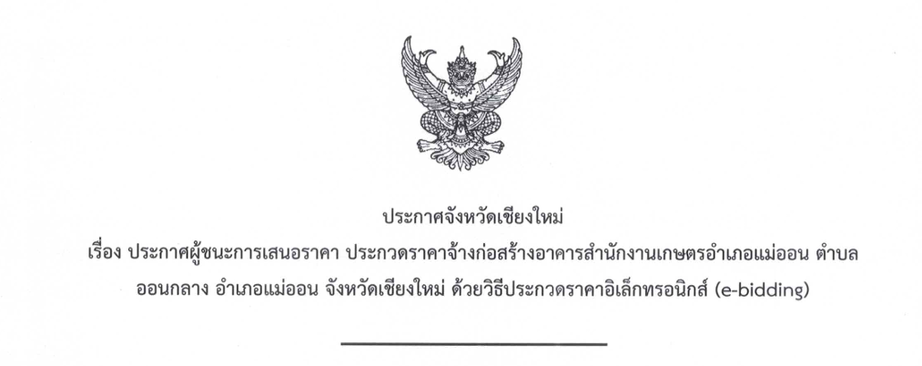 ประกาศผู้ชนะการเสนอราคา ประกวดราคาจ้างก่อสร้างอาคารสำนักงานเกษตรอำเภอแม่ออน ด้วยวิธีประกวดราคาอิเล็กทรอนิกส์ (e-bidding)