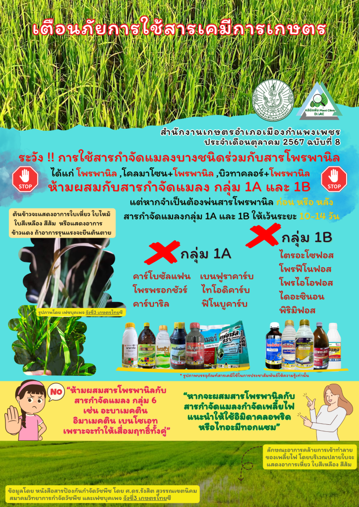 เตือนภัยการใช้สารเคมีการเกษตร ระวัง!!การใช้สารกำจัดแมลงบางชนิดร่วมกับสารโพรพานิล ได้แก่ โพรพานิล, โคลมาโซน+โพรพานิล,บิวทาคลอร์,โพรพานิล ห้ามผสมกับสารกำจัดแมลง กลุ่ม 1A และ 1B แต่หากจำเป็นต้องพ่นสารโพรพานิลก่อน หรือ หลัง สารกำจัดแมลงกลุ่ม 1A และ 1B ให้เว้นระยะ 10-14 วัน