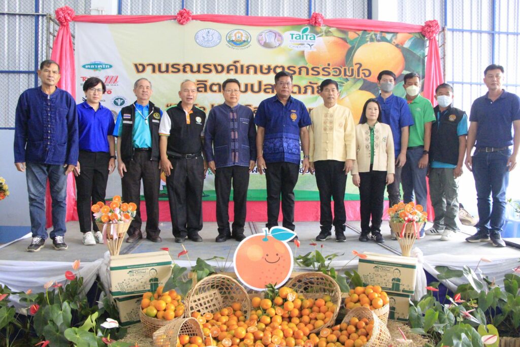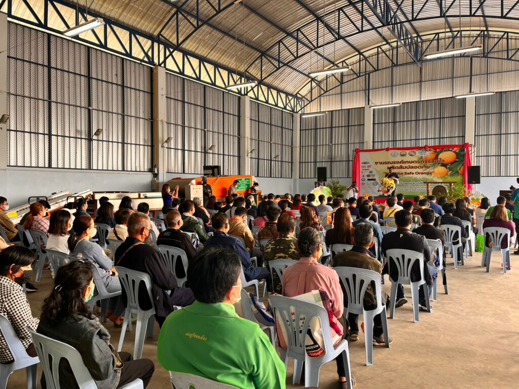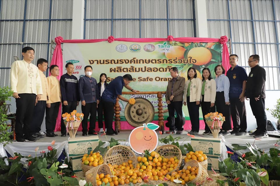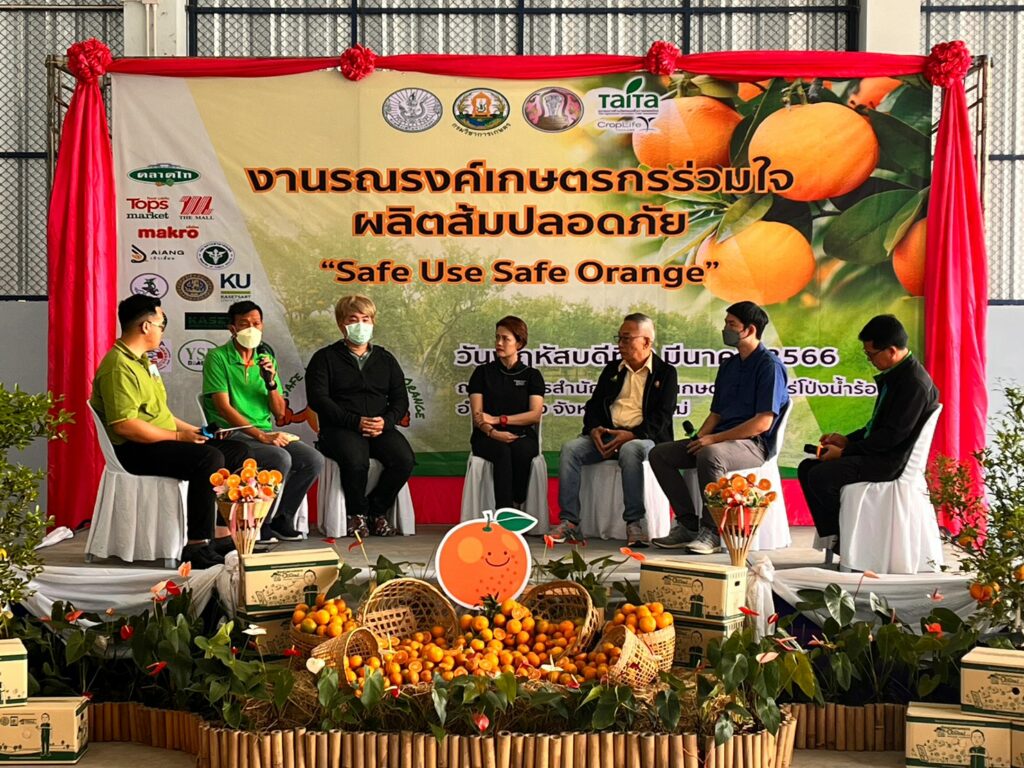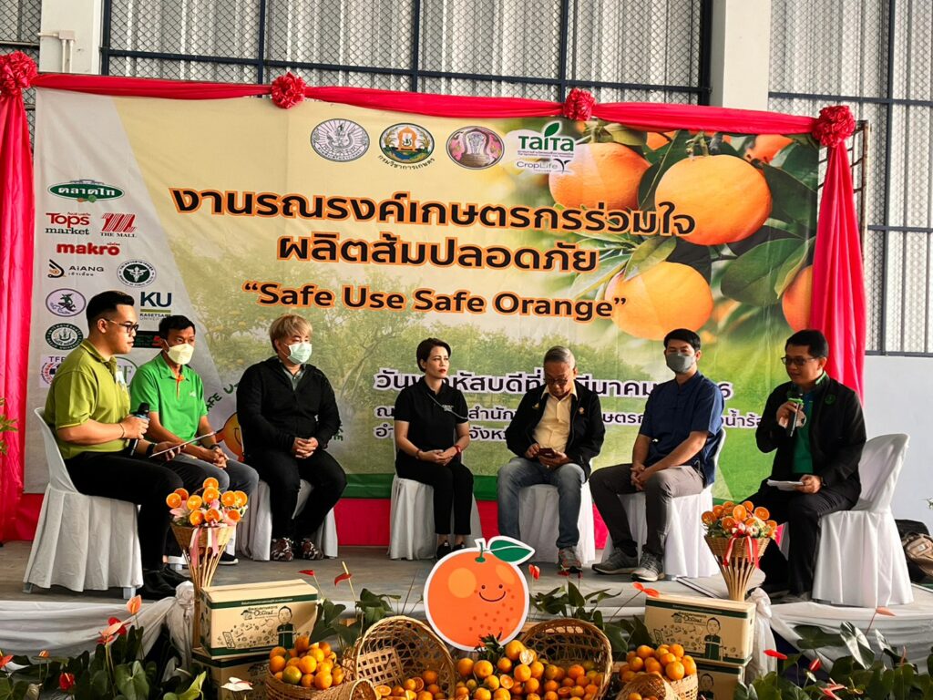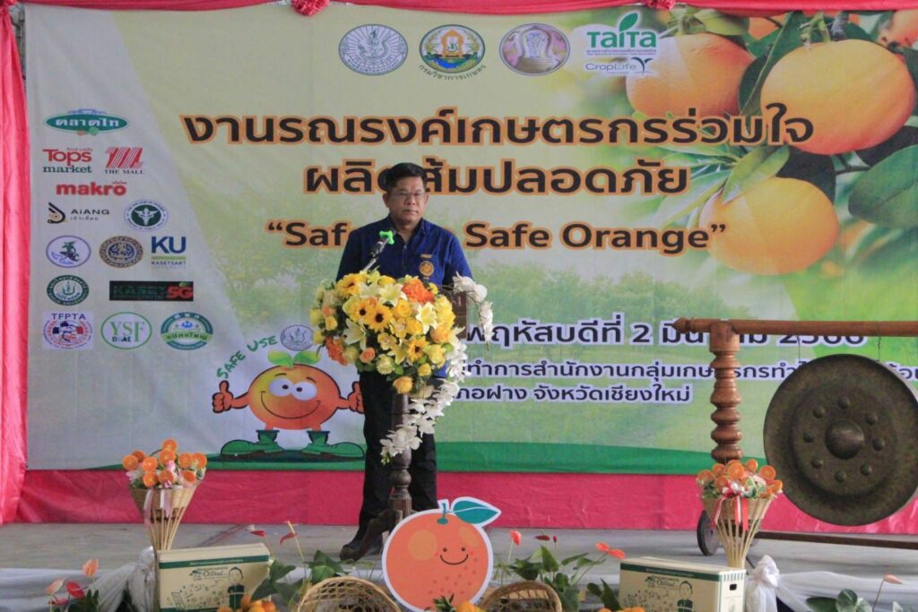 นายรพีทัศน์ อุ่นจิตตพันธ์ รองอธิบดีกรมส่งเสริมการเกษตร กล่าวว่า กรมส่งเสริมการเกษตร ได้ให้ความสำคัญกับการผลิตส้มปลอดภัย จึงได้ดำเนินโครงการรณรงค์เฝ้าระวังสารเคมีตกค้างในผลผลิตส้มขึ้น เพื่อส่งเสริมการผลิตและการจัดการสินค้าเกษตรด้วย BCG Model เสริมสร้างความรู้ความเข้าใจให้เกษตรกรผลิตส้มปลอดภัย ส่งเสริม สนับสนุนให้เกษตรกรผู้ปลูกส้มดำเนินการจัดการศัตรูพืชด้วยวิธีผสมผสาน รวมถึงการใช้ชีวภัณฑ์และแมลงศัตรูธรรมชาติ ปฏิบัติตามหลักปฏิบัติทางการเกษตรที่ดี (GAP) นำเกษตรกรเข้าสู่การควบคุมคุณภาพการเพาะปลูก ส่งเสริมการผลิตสินค้าเกษตรให้มีคุณภาพมาตรฐานความปลอดภัย โดยมีแนวทางการพัฒนาสนับสนุนการผลิตที่เป็นมิตรกับสิ่งแวคล้อม ลด ละ เลิกการใช้สารเคมีที่เป็นอันตราย เพื่อลดผลกระทบต่อสิ่งแวคล้อม ผลผลิตทางการเกษตรไม่มีการปนเปื้อนของสารเคมีทางการเกษตรที่เป็นอันตราย ล่าสุดกรมส่งเสริมการเกษตร จังหวัดเชียงใหม่ กรมวิชาการเกษตร สมาคมการค้านวัตกรรมเพื่อการเกษตรไทย (ไทท้า) และภาคเอกชน ร่วมจัดงานรณรงค์เกษตรกรร่วมใจผลิตส้มปลอดภัย “Safe Use Safe Orange” ขึ้น ณ ที่ทำการสำนักงานกลุ่มเกษตรกรทำไร่โปงน้ำร้อน ตำบลโป้งน้ำร้อน อำเภอฝาง จังหวัดเชียงใหม่เพื่อประชาสัมพันธ์และสร้างการรับรู้ให้กับเจ้าหน้าที่และเกษตรกรในพื้นที่ปลูกส้มได้รับทราบวิธีการจัดการพื้นที่ปลูกอย่างปลอดภัย โดยมีการเสวนาพิเศษ “ชี้ช่องส่องตลาด…ส้มไทย จากผู้ผลิตสู่ผู้บริโภค” โดย ตลาดไท บริษัท เดอะมอลล์กรุ๊ป จำกัด บริษัท เซ็นทรัล ฟู้ด รีเทล จำกัด และบริษัท สยามเม็คโคร จำกัด (มหาชน) ประธานกลุ่มแปลงใหญ่ส้มสายน้ำผึ้ง นอกจากนี้ยังจัดให้เกษตรกรผู้ข้าร่วมงานได้เรียนรู้และบริการ ได้แก่