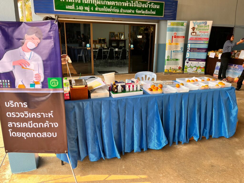 6) การใช้โดรนทางการเกษตร อีกทั้งยังมีการให้บริการตรวจกัดกรองความเสี่ยงจากการสัมผัสสารเคมีกำจัดศัตรูพืชละตรวจวิเคราะห์สารเคมีตกค้างในส้ม