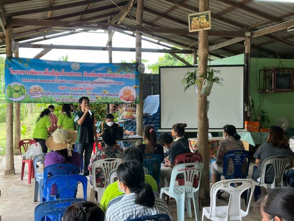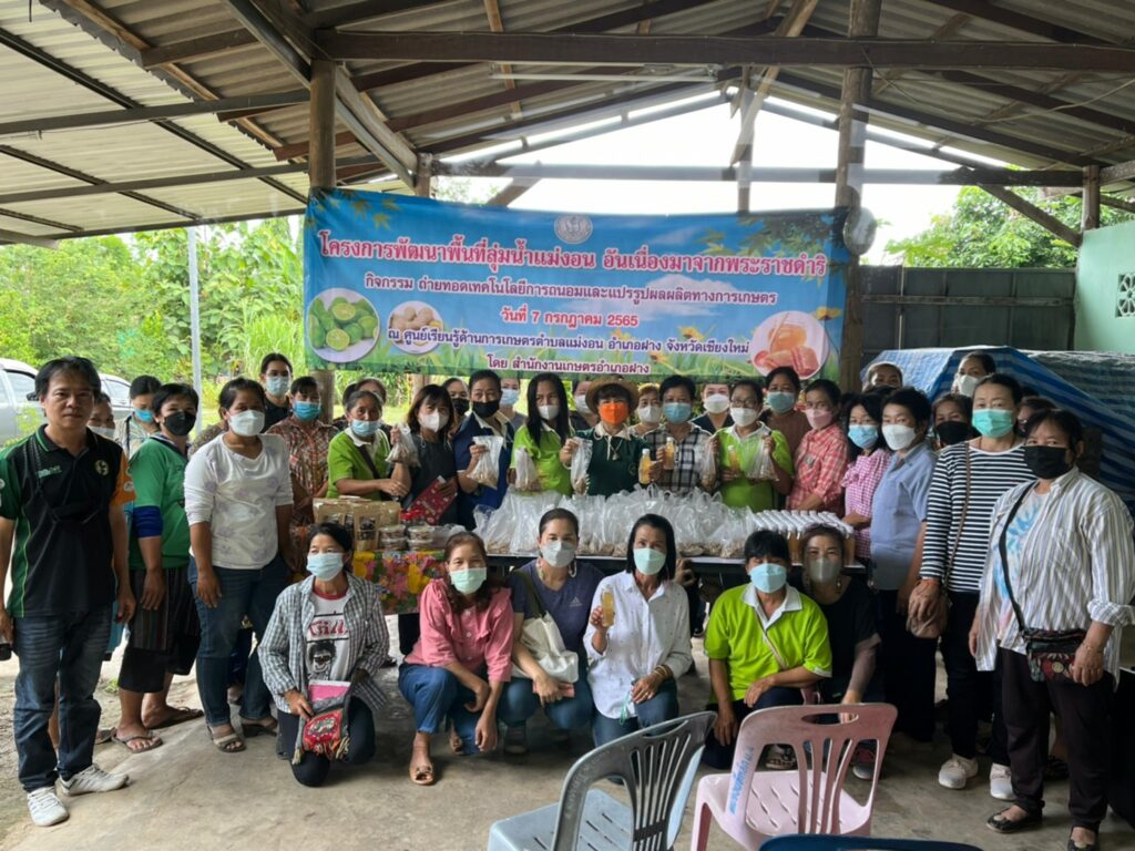 วันที่ 7 กรกฎาคม 2565 เวลา 08.30 น. นายประเสริฐ พรหมวรรณ เกษตรอำเภอฝาง มอบหมายให้เจ้าหน้าที่สำนักงานเกษตรอำเภอฝาง ดำเนินการตามโครงการพัฒนาพื้นที่ลุ่มน้ำแม่งอน อันเนื่องมาจากพระราชดำริ กิจกรรม ถ่ายทอดเทคโนโลยีการถนอมและแปรรูปผลผลิตทางการเกษตร แก่กลุ่มแม่บ้านเกษตรกร โดยการผลิตน้ำขิงสมุนไพร และขิงแผ่นอบน้ำผึ้ง ณ ศูนย์เรียนรู้ด้านการเกษตรตำบลแม่งอน อำเภอฝาง จังหวัดเชียงใหม่