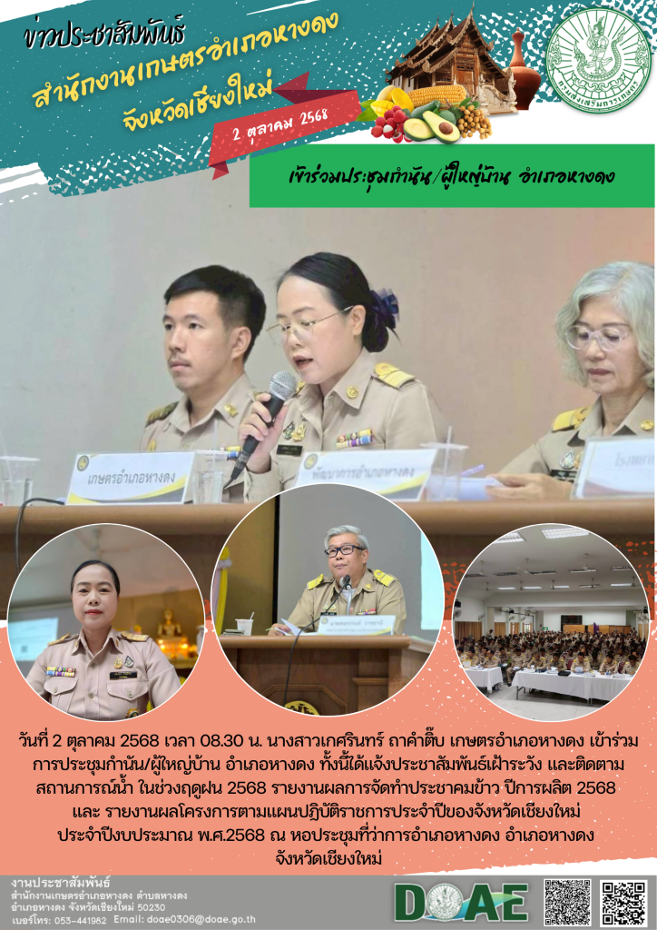 วันที่ 2 ตุลาคม 2568 เวลา 08.30 น. นางสาวเกศรินทร์ ถาคำติ๊บ เกษตรอำเภอหางดง เข้าร่วมการประชุมกำนัน/ผู้ใหญ่บ้าน อำเภอหางดง ทั้งนี้ได้แจ้งประชาสัมพันธ์เฝ้าระวัง และติดตามสถานการณ์น้ำ ในช่วงฤดูฝน 2568 รายงานผลการจัดทำประชาคมข้าว ปีการผลิต 2568 และ รายงานผลโครงการตามแผนปฏิบัติราชการประจำปีของจังหวัดเชียงใหม่ ประจำปีงบประมาณ พ.ศ.2568 ณ หอประชุมที่ว่าการอำเภอหางดง อำเภอหางดง จังหวัดเชียงใหม่
