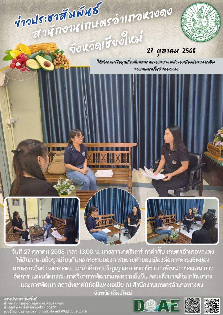 วันที่ 27 ตุลาคม 2568 เวลา 13.00 น. นางสาวเกศรินทร์ ถาคำติ๊บ เกษตรอำเภอหางดง ให้สัมภาษณ์ข้อมูลเกี่ยวกับผลกระทบของการขยายตัวของเมืองต่อการดำรงชีพของเกษตรกรในอำเภอหางดง แก่นักศึกษาปริญญาเอก สาขาวิชาการพัฒนา วางแผน การจัดการ และนวัตกรรม ภาควิชาการพัฒนาและความยั่งยืน คณะสิ่งแวดล้อมทรัพยากรและการพัฒนา สถาบันเทคโนโลยีแห่งเอเชีย ณ สำนักงานเกษตรอำเภอหางดง จังหวัดเชียงใหม่