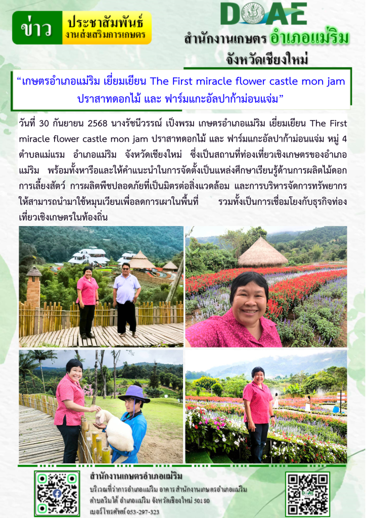 Continue Reading Previous “เกษตรอำเภอแม่ริม เข้าร่วมการประชุมเกษตรอำเภอ ประจำเดือน ตุลาคม 2568”Next “เกษตรอำเภอแม่ริม เยี่ยมเยียนเกษตรกรทำนา” Related Posts “เกษตรอำเภอแม่ริม เยี่ยมเยียนเกษตรกรผู้ผลิตกุหลาบกระถาง” 2 ตุลาคม 2025 maerim65 “เกษตรอำเภอแม่ริม เยี่ยมเยียนเกษตรกรทำนา” 2 ตุลาคม 2025 maerim65 “เกษตรอำเภอแม่ริม เข้าร่วมการประชุมเกษตรอำเภอ ประจำเดือน ตุลาคม 2568” 29 กันยายน 2025 maerim65