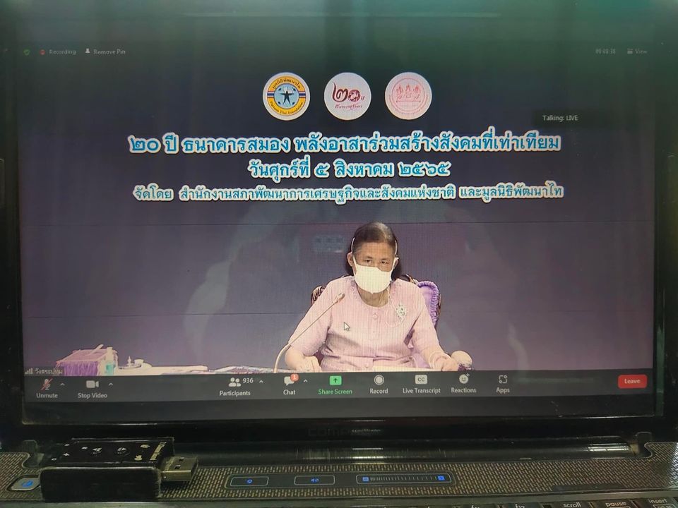 วันศุกร์ที่ ๕ สิงหาคม ๒๕๖๕ เวลา ๑๕.๐๐น. สมเด็จพระกนิษฐาธิราชเจ้า กรมสมเด็จพระเทพรัตนราชสุดาฯ สยามบรมราชกุมารีมีพระราชดำรัสเปิดงาน และทรงปาฐกถาพิเศษ ณ วังสระปทุมวังสระปทุมทอดพระเนตรนิทรรศการเสมือนจริง โดยมีวุฒิอาสาธนาคารสมอง เจ้าของผลงานที่ได้รับคัดเลือกมาจัดนิทรรศการเสมือนจริง เฝ้าทูลละอองพระบาทจากห้องอำนวยการจัดการประชุมออนไลน์ เพื่อตอบข้อซักถามแบบ Real Timeจัดโดย สำนักงานสภาพัฒนาการเศรษฐกิจและสังคมแห่งชาติ (สศช.)และมูลนิธิพัฒนาไท (มพท.)พื่อน้อมสำนึกพระมหากรุณาธิคุณ และเผยแพร่พระเกียรติคุณและพระอัจฉริยภาพของสมเด็จพระนางเจ้าพระบรมราชินีนาถ พระบรมราชชนนีพันปีหลวง ที่ทรงมีพระราชดำริในการจัดตั้งธนาคารสมองและทรงเปิดโอกาสให้ผู้เกษียณอายุเข้าร่วมพัฒนาประเทศ สังคม และชุมชน ให้เจริญก้าวหน้าและมีคุณภาพชีวิตที่ดีขึ้นรวมทั้งเผยแพร่ผลการดำเนินงานของธนาคารสมองตลอดระยะเวลา ๒๐ ปี ในการร่วมขับเคลื่อนการพัฒนาประเทศให้แก่ภาคีการพัฒนา และสาธารณชนได้รับทราบ ทั้งนี้นายเจริญ พิมพ์ขาล เกษตรจังหวัดเชียงใหม่ พร้อมคณะเจ้าหน้าที่ เฝ้าทูลละอองพระบาทสมเด็จพระกนิษฐาธิราชเจ้า กรมสมเด็จ พระเทพรัตนราชสุดาฯ สยามบรมราชกุมารี ในงานดังกล่าวผ่านสื่ออิเล็กทรอนิกส์ ณ สำนักงานเกษตรจังหวัดเชียงใหม่