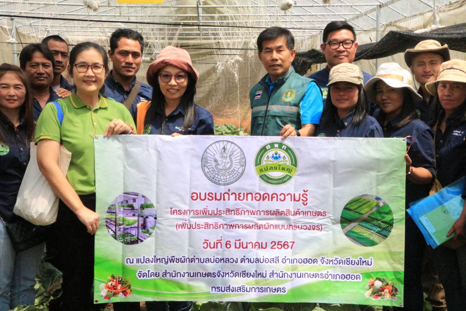วันที่ 6 มีนาคม 2567เวลา 11.00 น.นายเจริญ พิมพ์ขาล เกษตรจังหวัดเชียงใหม่ ขับเคลื่อนโครงการแปลงใหญ่พืชผัก บ้านแม่โถ ตำบลบ่อสลี อำเภอฮอด จังหวัดเชียงใหม่ โดยมีนางณัฐธยาน์ ศรีสุวรรณ รักษาราชการแทนเกษตรอำเภอฮอดให้ข้อมูลการดำเนินงานพร้อมทั้งเกษตรกรแปลงใหญ่ร่วมกิจกรรมดังกล่าวในครั้งนี้ จังหวัดเชียงใหม่เป็นแหล่งผลิตพืชผักที่มีคุณภาพแหล่งใหญ่ มีพื้นที่การผลิตประมาณ 100,000ไร่ ที่ผ่านมาเกษตรกรผลิตเน้นด้านปริมาณทำให้ผลผลิตไม่มีคุณภาพ ส่งผลต่อสุขภาวะ ผู้ผลิต ผู้บริโภค และสิ่งแวดล้อม ตลอดจนไม่สามารถต่อรองด้านราคาได้ทำให้เกษตรกรมีความเสี่ยงด้านรายได้และการประกอบอาชีพ โดยเฉพาะอย่างยิ่งที่อำเภอฮอดที่เป็นแหล่งผลิตพืชผักขนาดใหญ่ สำนักงานเกษตรจังหวัดตระหนักถึงความเสี่ยงของเกษตรกรดังนั้น จึงส่งเสริมการผลิตพืชผักครบวงจรภายใต้ BCG Model ตามระบบส่งเสริมเกษตรแปลงใหญ่ในกิจกรรม 5 ด้าน รวมกลุ่มวางแผนการผลิต การตลาด ส่งเสริมการผลิตให้ได้ทั้งปริมาณ คุณภาพได้มาตรฐานGAPนำนวัตกรรมความรู้เทคโนโลยีมาปรับใช้กับการเกษตร ดังกลุ่มแปลงใหญ่พืชผักตำบลบ่อหลวง-บ่อสลี ที่รวมกลุ่มเกษตรกรรุ่นใหม่ ประสบความสำเร็จในการสืบทอดอาชีพการปลูกพืชผักจากรุ่นบรรพบุรุษ มาปรับแนวคิดโดยใช้เทคโนโลยี และเน้นคุณภาพมาตรฐานครบวงจรตั้งแต่เพาะต้นกล้า พร้อมลดต้นทุนการผลิตพืชผักในโรงเรือนใช้พลังงานแสงอาทิตย์ในแปลงปลูก การวางระบบน้ำ การทำปุ๋ยจากไส้เดือน จำหน่ายแบบออนไลน์การผลิต จนสามารถเชื่อมโยงตลาด Modern trade ทั้งในและต่างประเทศได้อย่างเป็นระบบและยังนำพันธุ์พืชผักกะหล่ำพันธุ์หวานจากประเทศญี่ปุ่นทดสอบพันธุ์ ภายใต้ระบบอินทรีย์เตรียมขยายผลสร้างรายได้แก่เกษตรกรในชุมชนต่อไปอย่างยั่งยืน