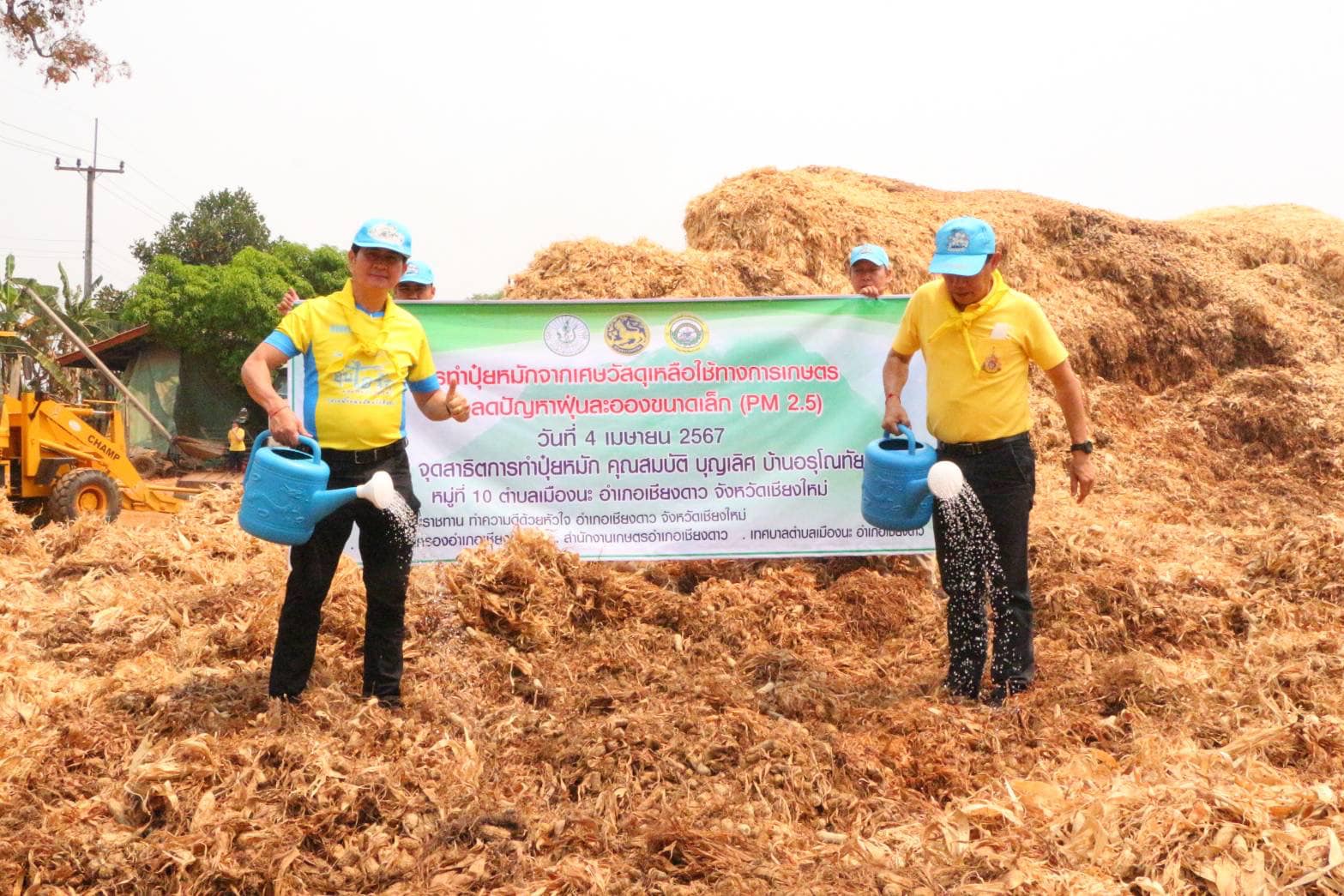 วันที่ 4 เมษายน 2567 เวลา 13.30 น. นายเจริญ พิมพ์ขาล เกษตรจังหวัดเชียงใหม่ ร่วมการทำปุ๋ยหมักจากเศษวัสดุเหลือใช้ทางการเกษตรเพื่อลดปัญหาฝุ่นละอองขนาดเล็ก (PM 2.5) ณ จุดสาธิตการทำปุ๋ยหมัก บ้านอรุโณทัย หมู่ที่ 10 ตำบลเมืองนะ อำเภอเชียงดาว จังหวัดเชียงใหม่ จังหวัดเชียงใหม่พื้นที่ปลูกข้าวโพด 269,419 ไร่ มีเศษวัสดุเหลือใช้ทางการเกษตรจากข้าวโพด 731,910 ตัน โดยมีมากที่อำเภอเชียงดาว แม่อาย และเวียงแหง ตามลำดับ ที่ผ่านมากรมส่งเสริมการเกษตร ร่วมบูรณาการหน่วยงานในพื้นที่ร่วมบริหารจัดการเศษวัสดุเหลือใช้ทางการเกษตรโดยใช้ความรู้นวัตกรรม อาทิผลิตปุ๋ยหมัก อาหารสัตว์ ไถกลบ ทำพลังงานทดแทน ทำเป็นผลิตภัณฑ์เพิ่มมูลค่าอื่นๆ ดังวันนี้ที่อำเภอเชียงดาวที่บริหารจัดการโดยทำเป็นปุ๋ยหมัก 150 ตัน เพื่อเป็นการร่วมเป็นพลังส่วนหนึ่ง ในการสร้างการตระหนักรู้วิธีการเทคโนโลยีไม่เผาและเปลี่ยนการเพิ่มมูลค่าเพื่อให้สามารถเป็นต้นแบบแก่คนในพื้นที่ และเป็นการสร้างจิตสำนึกรักษาทรัพยากรธรรมชาติที่มีอยู่เกิดความยั่งยืนในการใช้ทรัพยากรในการทำการเกษตรต่อไป สำหรับการทำกิจกรรมครั้งนี้นายกฤตพล รชตเมธานนท์ นายอำเภอเชียงดาว เป็นประธานเปิดกิจกรรม ร่วมกับ สำนักงานเกษตรอำเภอ จิตอาสาพระราชทาน ทำความดีด้วยหัวใจอำเภอเชียงดาว ที่ทำการปกครองอำเภอเชียงดาว สำนักงานเกษตรอำเภอเชียงดาว เทศบาลตำบลเมือง อำเภอเชียงดาว
