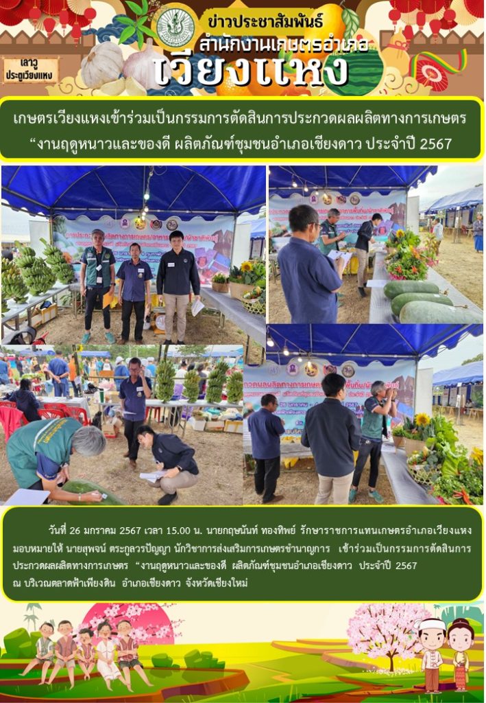 26ก.พ./24 เกษตรเวียงแหงเข้าร่วมเป็นกรรมการตัดสินการประกวดผลผลิตทางการเกษตร “งานฤดูหนาวและของดี ผลิตภัณฑ์ชุมชนอำเภอเชียงดาว ประจำปี 2567 26 กุมภาพันธ์ 2024ไม่มีหมวดหมู่admin