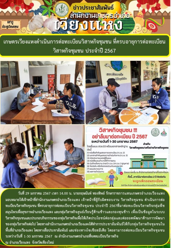 26ก.พ./24 เกษตรเวียงแหงดำเนินการต่อทะเบียนวิสาหกิจชุมชน ที่ครบอายุการต่อทะเบียนวิสาหกิจชุมชน ประจำปี 2567 26 กุมภาพันธ์ 2024ไม่มีหมวดหมู่admin