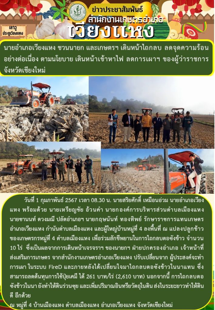 26ก.พ./24 นายอำเภอเวียงแหง ชวนนายก และเกษตรฯ เดินหน้าไถกลบ ลดจุดความร้อน อย่างต่อเนื่อง ตามนโยบาย เดินหน้าเข้าหาไฟ ลดการเผาฯ ของผู้ว่าราชการจังหวัดเชียงใหม่ 26 กุมภาพันธ์ 2024ไม่มีหมวดหมู่admin
